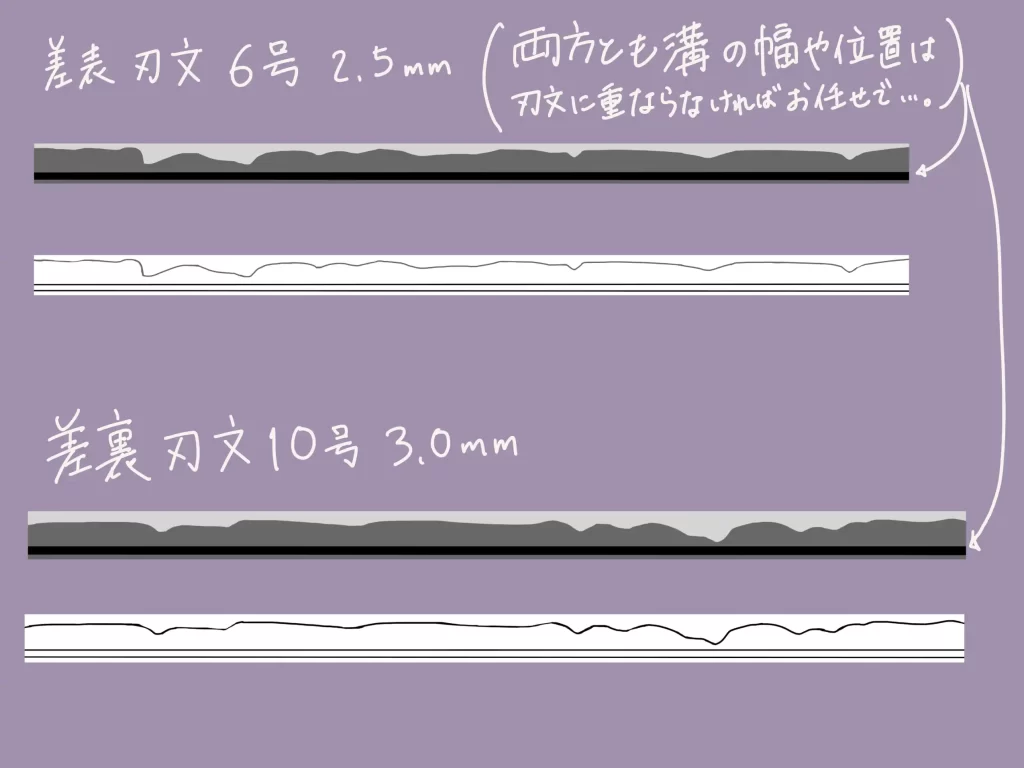 刃文オーダー後、職人様から「刃文を入れるなら日本刀の樋(ひ)(血流し、峰側の溝)も入れたいですよね?日本刀の形に準えて、刃の方は少し尖らせるような断面図にしたいですよね。」とご提案頂きました。そこまでできるんですか…!?