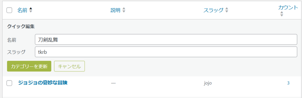クイック編集からスラッグ名を設定します。日本語でなければ何でもいいです。